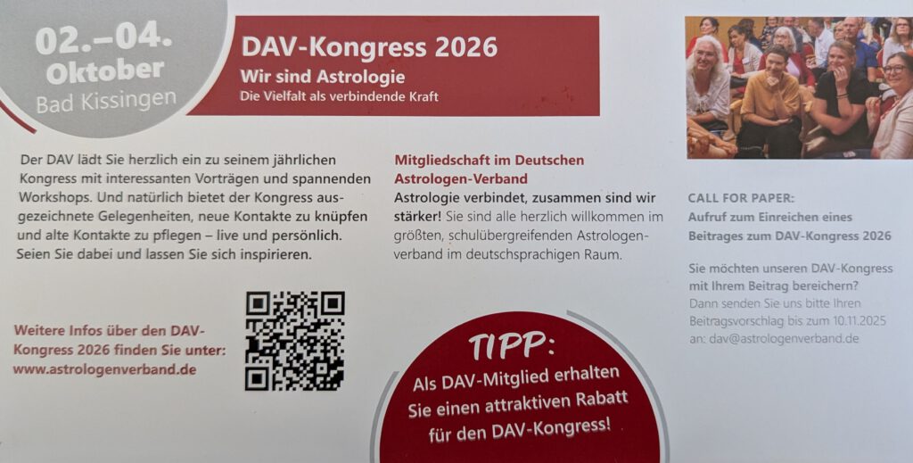Am vergangenen Wochenende fand der Kongress des Deutschen Astrologen Verbandes (DAV) 2025 in Bonn statt. Es war ein großartiges Event, an dem sich sowohl die deutschen Astrologen, als auch die Schweizer, die Österreicher, die Ukraine, die Niederlande und noch mehr getroffen haben.
