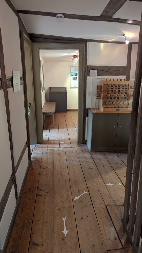Kepler lernte während seiner wissenschaftlichen Recherchen den mathematischen Tüftler Wilhelm Schickard kennen, der ihm von seiner Erfindung berichtete. Eine manuelle Rechenmaschine, die alle vier Grundrechenarten beherrschen sollte. Kepler war von der Effizienz dieser revolutionären Neuheit so begeistert, dass er direkt eine Anfertigung davon in Auftrag gab. Leider verbrannte das Original bei einem Hausbrand, doch wurden die Pläne dafür nicht beschädigt. So konnte Nachbauten angefertigt werden. Ein solcher Nachbau steht heute in dem kleinen Museum. Mit manuellen Rädchen lassen die die zu berechnenden Zahlen eingeben und durch Hebel und Drehknopfe bedienen. Es quietscht und knackt zwar laut, aber es funktioniert.